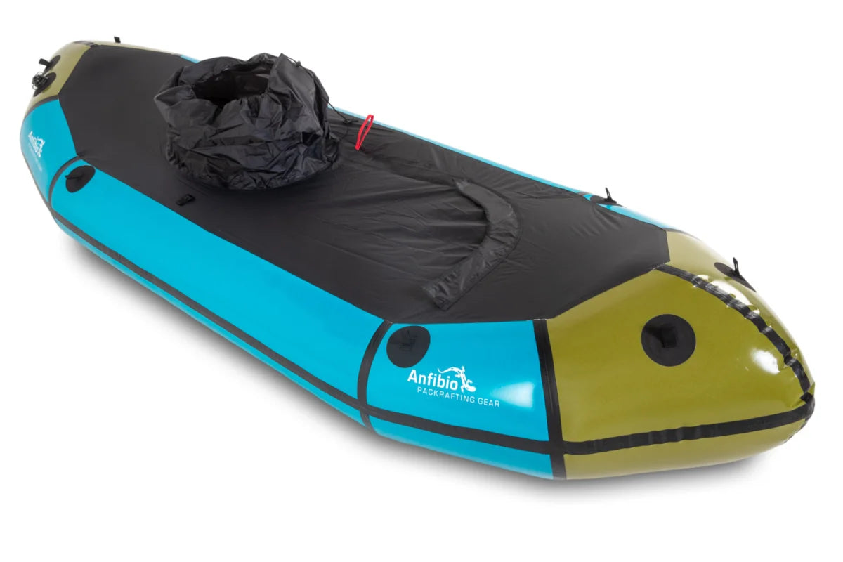 Die Spritzdecke erweitert das Einsatzspektrum des Bootes enorm. Ob Spritzwasser, Wellen, Regen oder Kälte – das Verdeck ist nicht nur Komfort sondern auch ein Sicherheitsaspekt. Sie ist nicht 100% dicht (über dem Reißverschluss kann etwas Wasser eindringen), aber bei gemäßigten Bedingungen völlig ausreichend. Die Spritzdecke lässt sich leicht öffnen und schließen, wobei das Boot mit aufgerolltem Verdeck auch offen gefahren werden kann. Dadurch ist das Packraft auch für Touren mit häufigen Ausstiegen, etwa durch Tragepassagen, Besichtigungen unbekannter Gewässer, Notausstiege, Trainings etc. geeignet. TubeBags (optional) Anfibio TubeBags sind zwei zentral positionierte, IPX7-wasserdichte Gepäckreißverschlüsse mit direkt hinterlegten, luft- und wasserdichten Innentaschen (je 70l). Das jeweilige Gepäckfach und die Hauptluftkammer bilden somit zwei voneinander getrennte Lufträume. Die Reißverschlüsse müssen für ihre Aufgabe nicht luftdicht sein, weil es konstruktionsbedingt nicht notwendig ist. Selbst leicht (!) geöffnet, erhält das System seine Funktion. Das macht es sehr resistent gegenüber Schmutz und Verschleiß. Weitere Eigenschaften/Vorteile