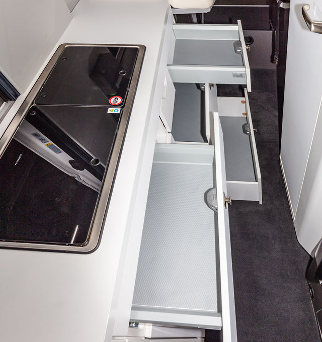 Die Antirutsch-/Schutzmatten sind speziell auf die Schubladen der Küchenzeile im VW Grand California 680 passgenau und aus einem sehr hochwertigen Material zugeschnitten.
