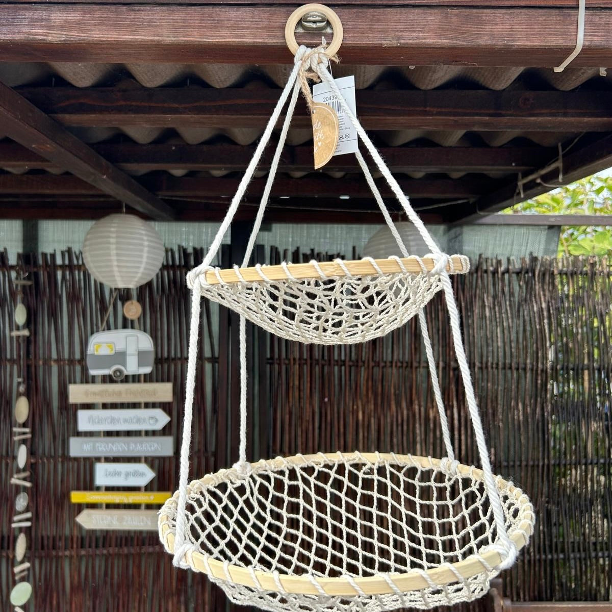 Handgefertigt aus natürlichem Material fügt sich der Hängekorb mit seinen Zwei Etagen perfekt in Euer Boho Style Vorzelt ein.