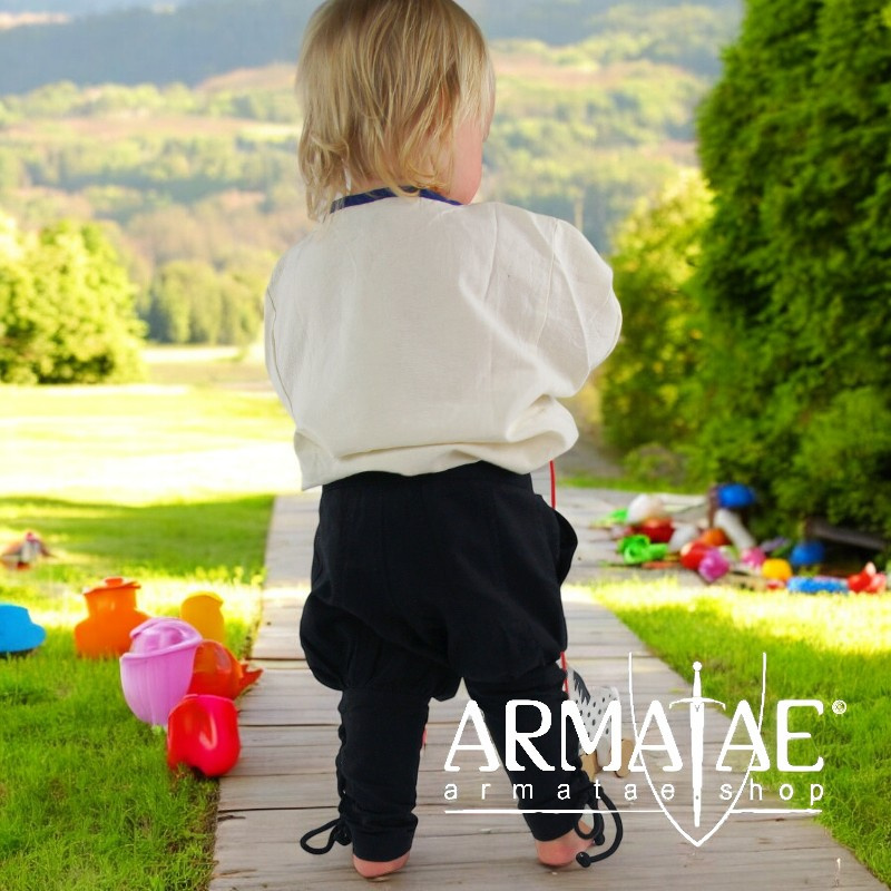 Liebevoll verarbeitete Kinderhose mit Beinschnürung an den Waden-Außenseiten. Die Schnürung ist frei von Metallösen und wird durch genähte „Knopflöcher“ geführt, so kann nichts an der Haut scheuern oder zwicken. Am Bund besitzt die Hose einen Knopf.