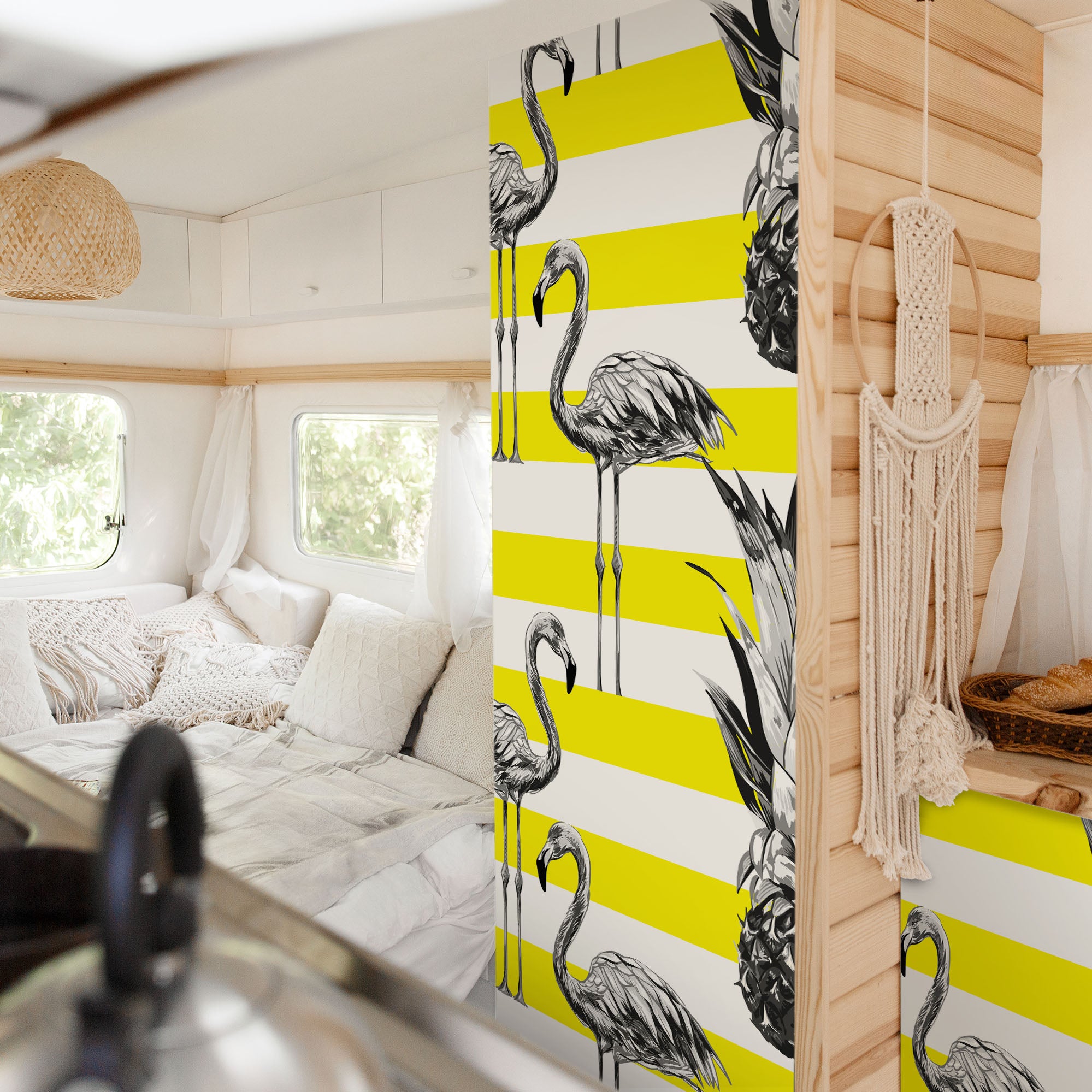 Camping ist nicht nur ein Abenteuer, sondern auch eine Lebenseinstellung. Doch manchmal sieht das mobile Zuhause ein wenig zu gewöhnlich aus. Wir haben die Lösung! Unsere Möbelfolie Flamingos Gelb verwandeln deinen Camper oder Wohnwagen in ein individuelles Paradies, das deinem persönlichen Stil entspricht.