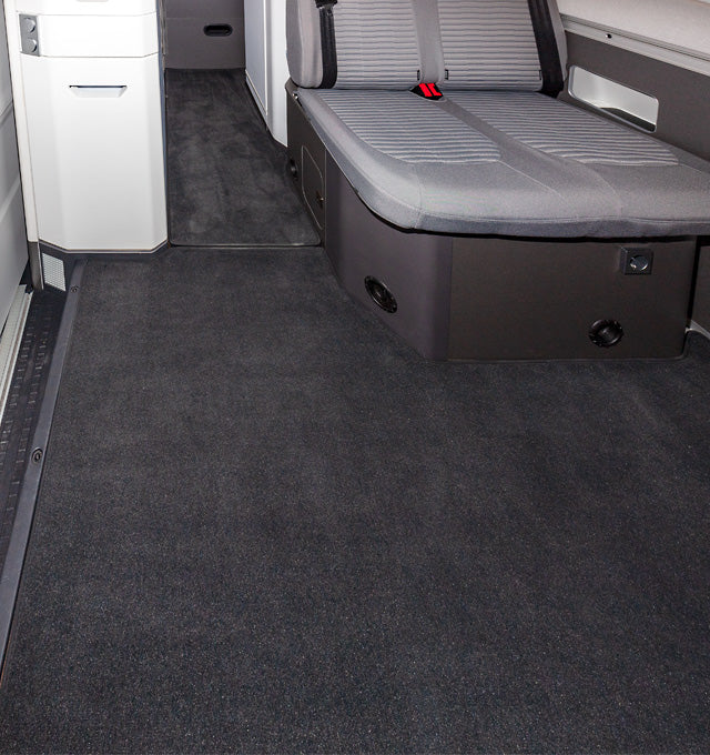Die Veloursteppiche für den Fahrgastraum schließen miteinander bündig ab und sind beim VW Grand California 600 (Art.-Nr.: 100708643) ein zweiteiliges und hier beim VW Grand California 680 ein dreiteiliges Set.